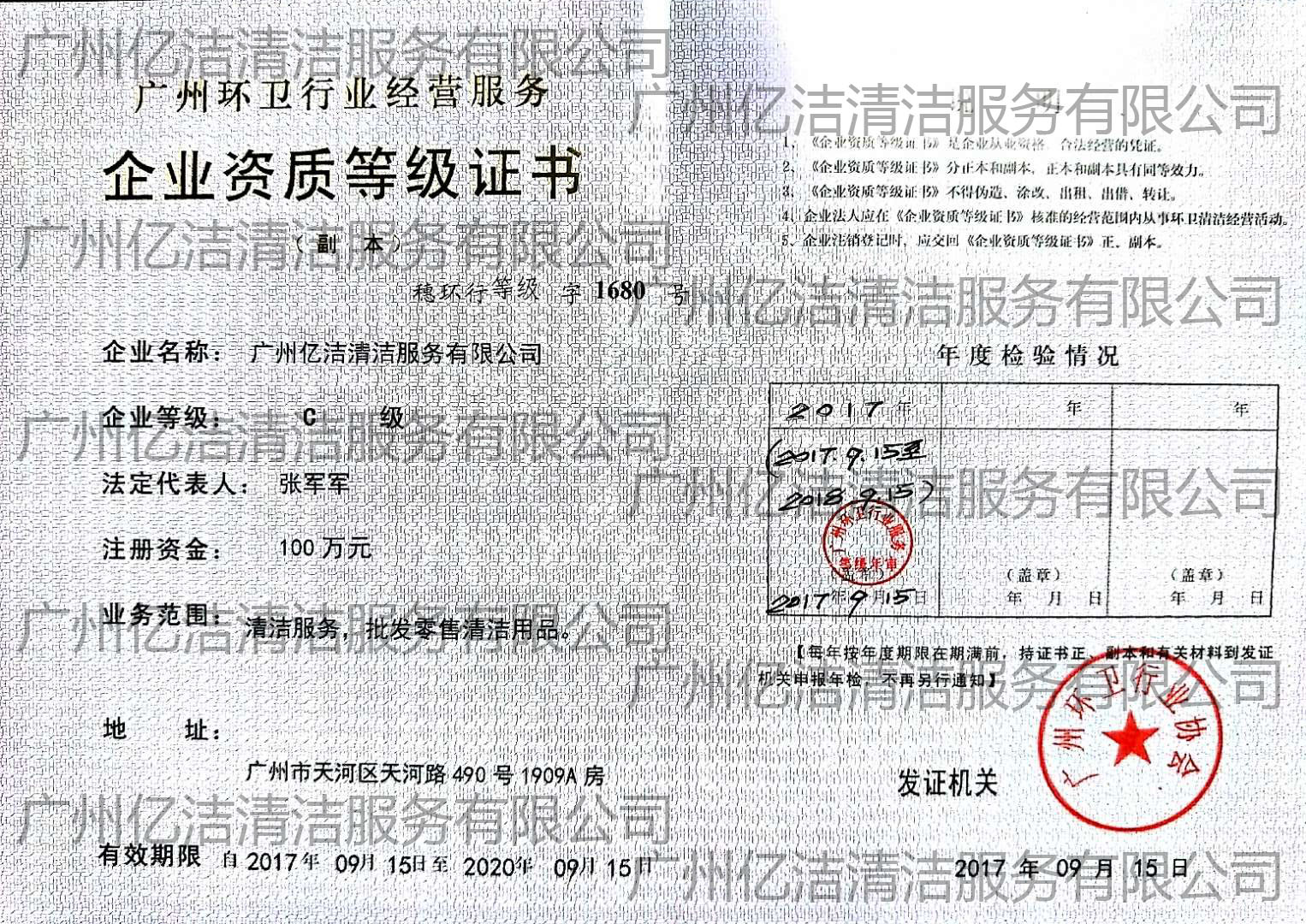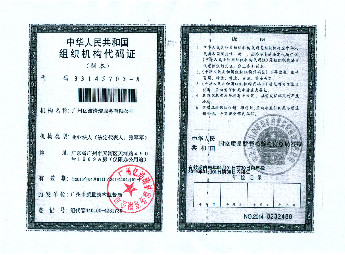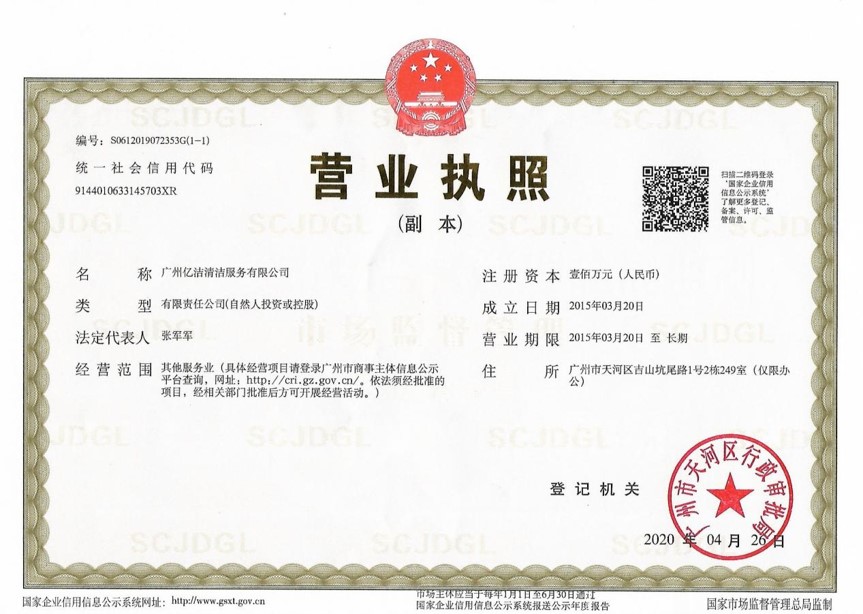 廣州億潔清潔服務(wù)有限公司是經(jīng)廣州市工商行政管理局批準(zhǔn)成立的(注冊(cè)資本:100萬(wàn)元人民幣)。具有獨(dú)立法人資質(zhì)。公司成立2015年,公司具備完善的管理體系和高素質(zhì)管理隊(duì)伍,擁有特種技術(shù)人員33名,保潔服務(wù)人員上萬(wàn)名,覆蓋廣州市,能及時(shí)調(diào)配并快速投入高效運(yùn)行。我們的每個(gè)員工都經(jīng)過公司的嚴(yán)格篩選,嚴(yán)格培訓(xùn),定期培訓(xùn)后持證上崗以保證服務(wù)品質(zhì),保障客戶的權(quán)利,利益,形象等不受損失。 廣州億潔清潔公司是一家設(shè)備齊全,技術(shù)強(qiáng)大的綜合型清潔服務(wù)公司,為客戶提供完善服務(wù)尊定了堅(jiān)定的基礎(chǔ)。 司于2010年全面推行了ISO9001質(zhì)量管理體系認(rèn)證和ISO14001國(guó)際環(huán)保體系認(rèn)證。先后獲得廣州高層建筑外墻清洗維修作業(yè)【安全資質(zhì)證書】、【廣州環(huán)衛(wèi)企業(yè)等級(jí)證書C級(jí)資質(zhì)】、廣州疾控中心頒發(fā)的【四害消殺服務(wù)資質(zhì)證】、【空氣治理A級(jí)資質(zhì)】、中國(guó)石材協(xié)會(huì)頒發(fā)的【石材資質(zhì)B級(jí)資質(zhì)】等。 廣州億潔清潔服務(wù)有限公司致力于打造專業(yè)、實(shí)惠、靠譜的保潔服務(wù)公司,把專業(yè)的事情交給專業(yè)的我們,您放心! 億潔清潔服務(wù)項(xiàng)目: 廣州保潔服務(wù):新建樓宇、別墅、酒店、醫(yī)院、辦公樓、賓館、企事業(yè)單位廠房竣工后開荒及裝修后精細(xì)保潔.工程保潔服務(wù)。 廣州物業(yè)托管:為廣州市各大企事業(yè)單位、賓館、政府機(jī)關(guān)、小區(qū)物業(yè)、酒店及廠房提供專業(yè)化保潔、園林、設(shè)施維護(hù)等管理服務(wù)。 廣州高空作業(yè):高空玻璃幕...[詳情]